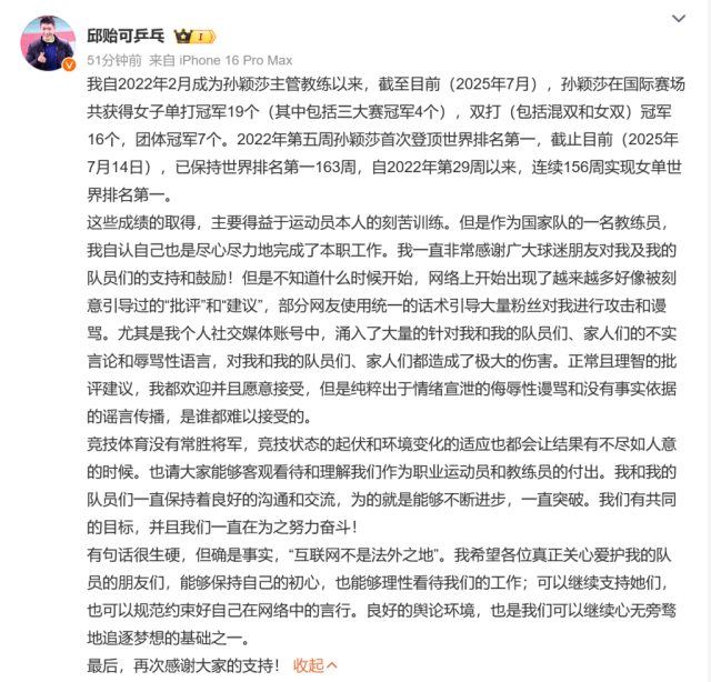 被粉丝攻击和谩骂,孙颖莎主管教练邱贻可回应:请理性看待我们的工作