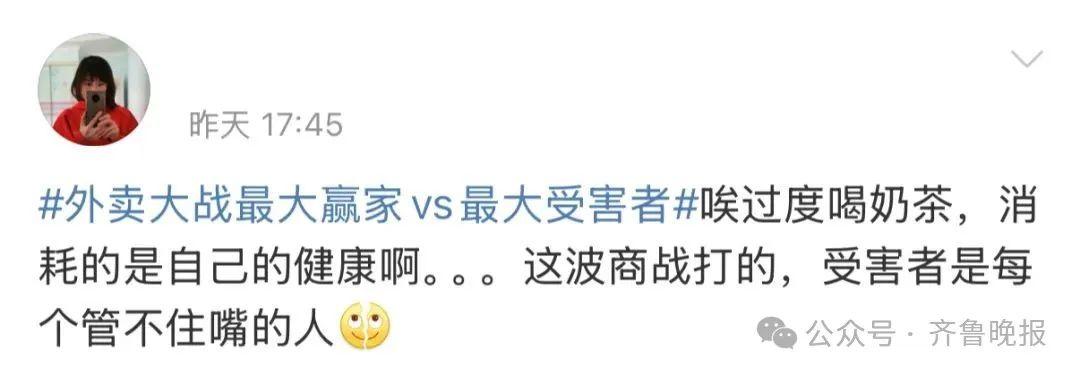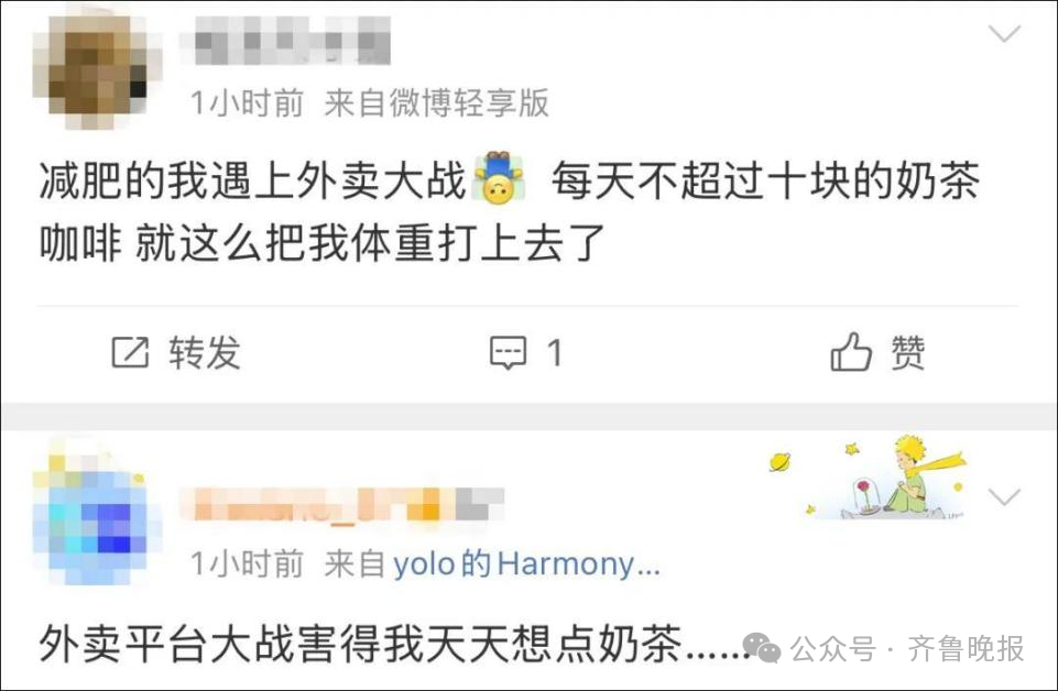 这份齁咸的炒鸡吃完口渴得很,而小甜水的存在弥补了炒鸡盐超标但糖不超标的“遗憾”,所以表面看上去这一单我省了几十块钱,但其实我明明可以不点,继续自己关心粮食和蔬菜。有这种得失之感的并不是我自己,网友们看着抢来的一冰箱奶茶,纷纷发出感慨:商战再打下去,他们将毫发无伤,我们喝成糖尿病。