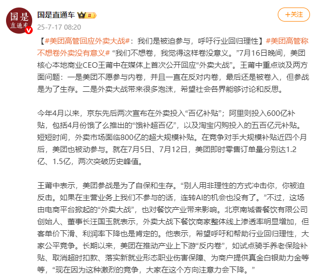 7月16日,据中新社国事直通车, 7月16日晚间,美团核心本地商业CEO王莆中在媒体上首次公开回应“外卖大战”。