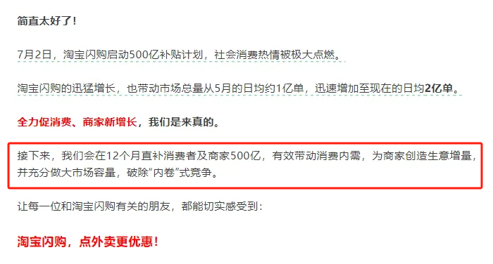 淘宝闪购表示:“接下来,我们会在12个月直补消费者及商家500亿,有效带动消费内需,为商家创造生意增量,并充分做大市场容量,破除‘内卷’式竞争。”
