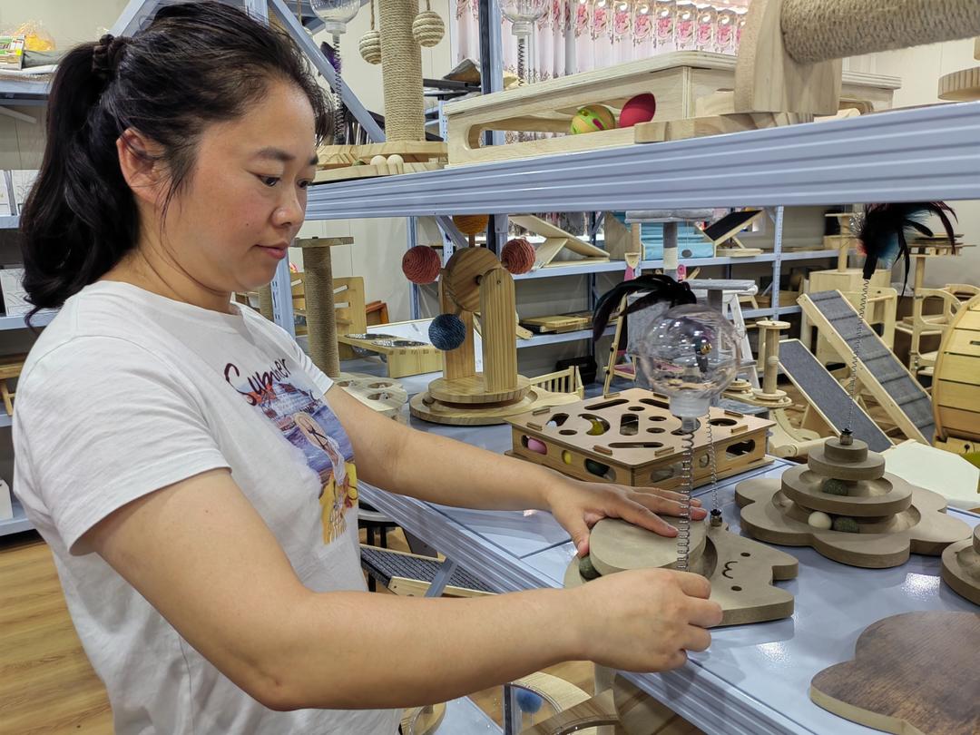 在宠物用品领域,曹县同样在发力。在曹县普连集镇中小企业孵化园内,曹县海纳木制工艺品有限公司的工人们正在熟练地操作着电锯、打磨机,将一块块板材加工成精致的宠物玩具。“我们以前主要做木盒、小型家具等木制品,2023年引进了专业设计团队,对生产线进行了全面改造。”企业总经理管玉静介绍,“像这种纯实木制作的宠物攀爬架,融入了多层立体结构、趣味玩具挂件等创意设计,在欧美市场特别受欢迎,单价能达到1000多元。”