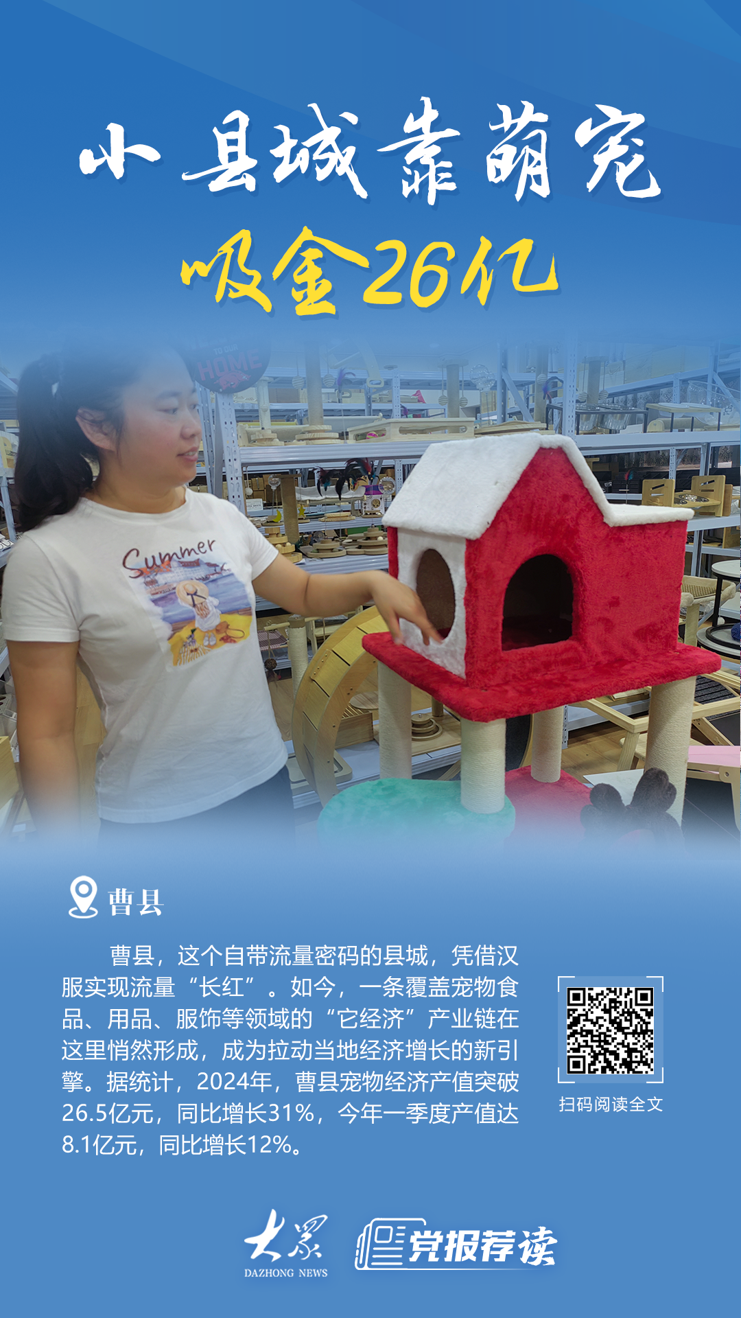 曹县,这个自带流量密码的县城,凭借汉服实现流量“长红”。如今,一条覆盖宠物食品、用品、服饰等领域的“它经济”产业链在这里悄然形成,成为拉动当地经济增长的新引擎。据统计,2024年,曹县宠物经济产值突破26.5亿元,同比增长31%,今年一季度产值达8.1亿元,同比增长12%。