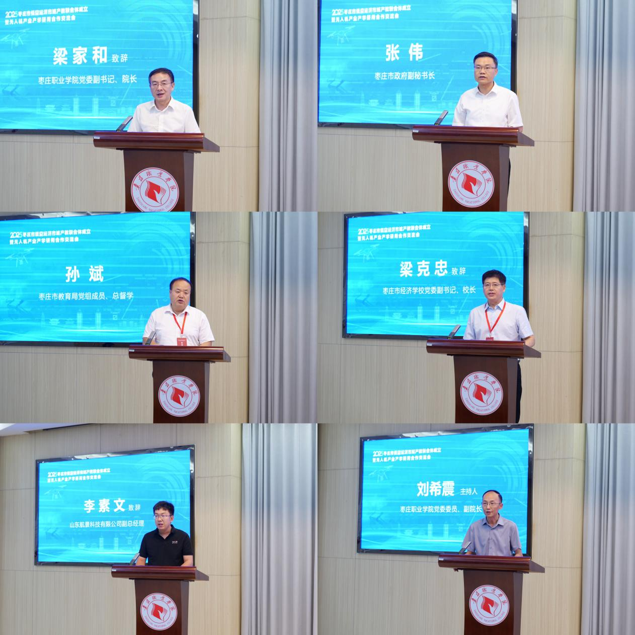 枣庄市低空经济市域产教联合体是响应国家产教融合政策、推动区域产业升级和人才培养的重要举措。该联合体依托于薛城经济开发区,由枣庄职业学院、枣庄经济学校、山东航景科技有限公司共同牵头,联合枣庄市内企业、高校、中职学校、科研机构、行业组织等40余家单位共同组建而成。联合体以“共建共享共赢”为原则,致力于打造一个集人才培养、技术研发、产业服务、政策支持于一体的综合性平台,通过整合各方资源,推动职业教育与产业需求的深度融合。会上,联合体牵头单位负责同志分别致辞。