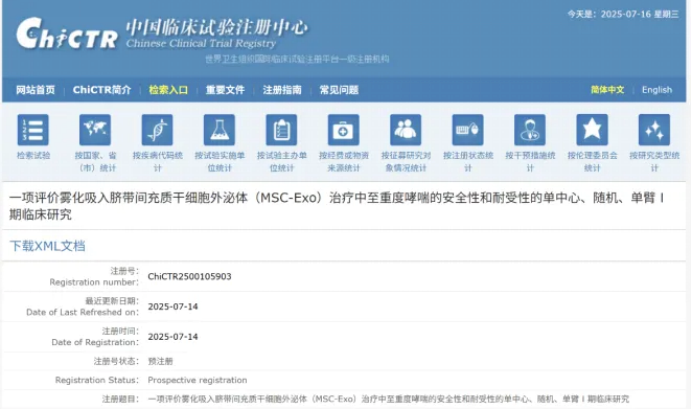 2025年7月15日,一项具有里程碑意义的临床研究在烟台毓璜顶医院正式启动。这项名为“一项评价雾化吸入脐带间充质干细胞外泌体(MSC-Exo)治疗中至重度哮喘的安全性和耐受性的单中心、随机、单臂Ⅰ期临床研究”的项目(注册号:ChiCTR2500105903),由烟台毓璜顶医院宋西成教授牵头发起。尤为瞩目的是,这是国际上首个探索通过雾化吸入方式,利用干细胞外泌体治疗哮喘的临床研究,标志着再生医学在呼吸疾病领域迈出了创新性的一步。