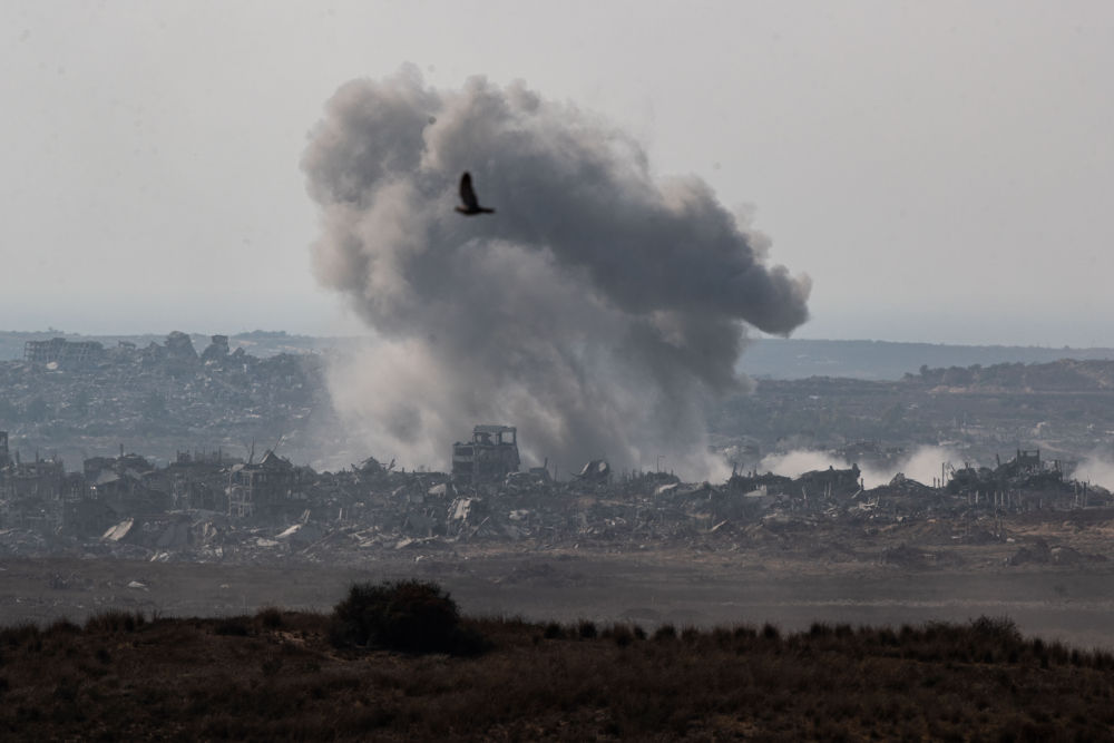 这张7月10日在以色列与加沙边境以色列一侧拍摄的照片显示,加沙地带遭袭后升起浓烟。