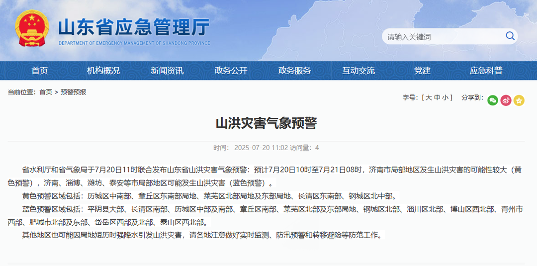 省水利厅和省气象局于7月20日11时联合发布山东省山洪灾害气象预警:预计7月20日10时至7月21日08时,济南市局部地区发生山洪灾害的可能性较大(黄色预警),济南、淄博、潍坊、泰安等市局部地区可能发生山洪灾害(蓝色预警)。