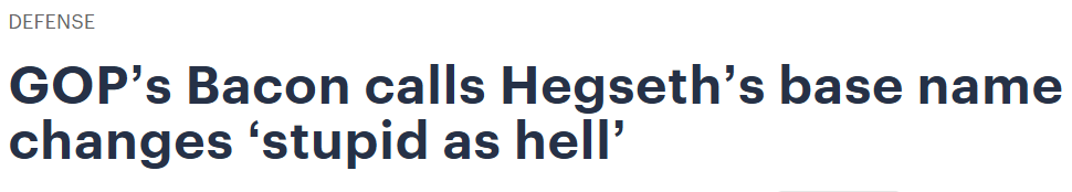 美国政府给各处地点改名引发的争吵,蔓延到了共和党内部。当地时间18日,共和党众议员唐·巴克炮轰国防部长赫格塞思,称防长试图把几个美军军事基地改用南北战争时期南方将军名字命名的做法“蠢到家了”。