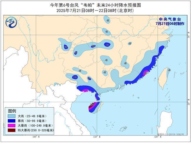 7月21日08时至22日08时,广东中东部和西南部、香港、澳门、海南岛、广西南部和西部、福建中东部、浙江东南部、江西西部、湖南西部和南部、湖北西部、台湾岛东部以及四川盆地南部、重庆南部、贵州北部和西南部、云南东南部等地有大到暴雨,其中,广东雷州半岛、海南岛中西部和北部、广西东南部沿海等地的部分地区有大暴雨,海南岛西北部局地有特大暴雨(250~320毫米)。