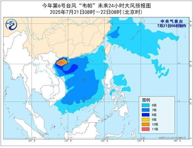 7月21日08时至22日08时,受“韦帕”和西南季风的共同影响,东海大部及钓鱼岛附近海域、巴士海峡、台湾海峡南部、南海大部、琼州海峡、东沙群岛、西沙群岛、中沙群岛、南沙群岛以及海南岛沿海、浙江沿海、广东中西部沿海、广西沿海等地将有6~7级风,阵风8~9级,其中北部湾、琼州海峡、广东西部沿海、广西沿海、海南岛沿海的风力可达8~9级,阵风10~11级,北部湾部分海域风力有10~11级,阵风12~13级。