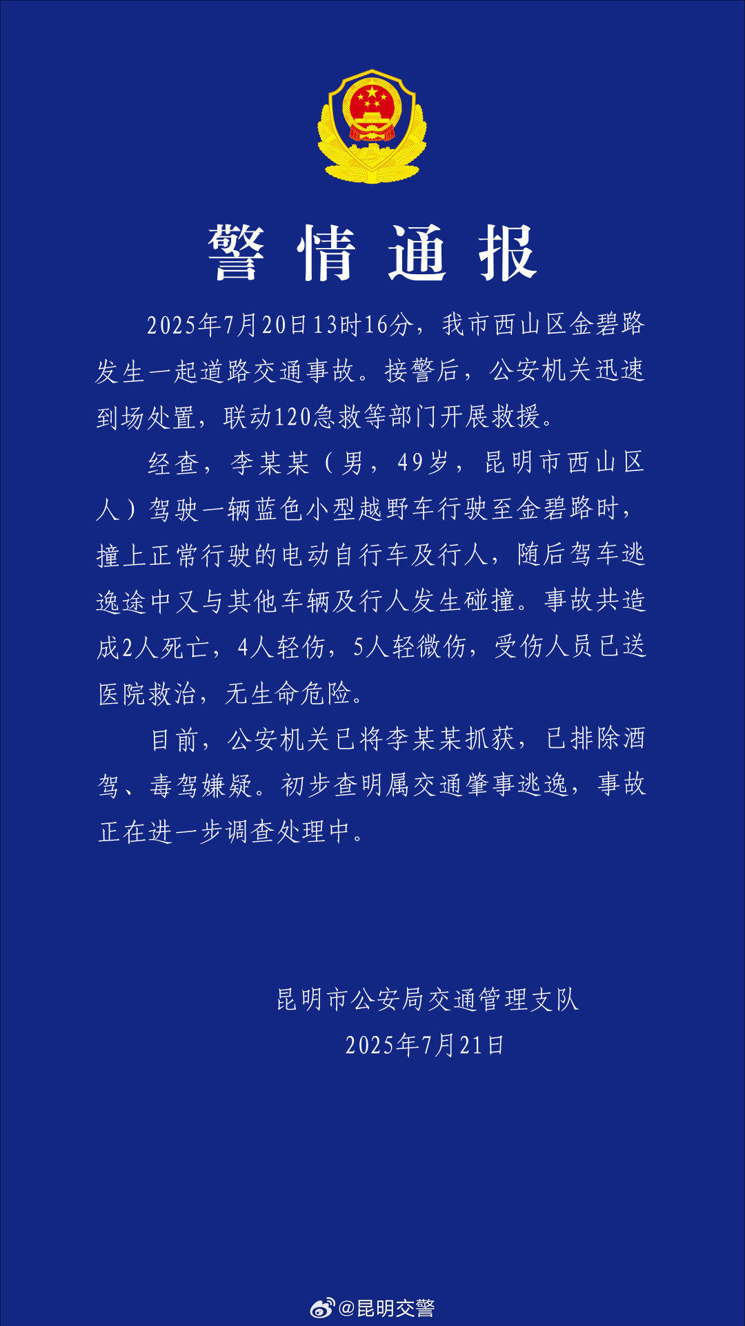 经查,李某某(男,49岁,昆明市西山区人) 驾驶一辆蓝色小型越野车行驶至金碧路时,撞上正常行驶的电动自行车及行人,随后驾车逃逸途中又与其他车辆及行人发生碰撞。事故共造成2人死亡,4人轻伤,5人轻微伤,受伤人员已送医院救治,无生命危险。