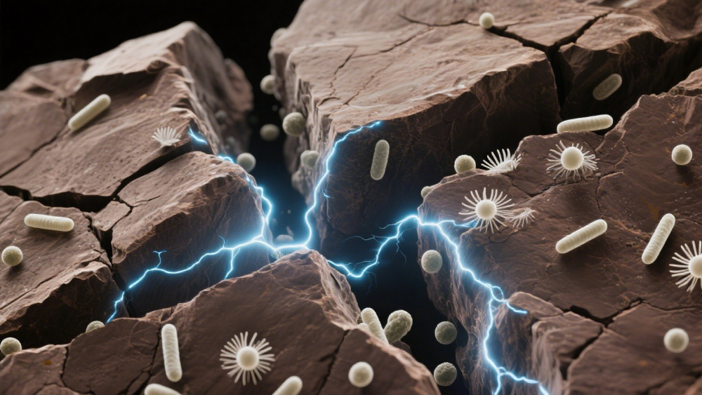 团队通过“压裂-反应”实验平台,模拟地下数公里内的断裂活动后发现,当岩石破裂产生新鲜表面时,断裂的化学键瞬间与水相遇,生成可观的氢气和过氧化氢,导致铁的氧化和还原循环,在这个过程中持续释放电子。这些电子进一步在碳、硫、氮等生命必须元素之间流动,形成看不见的“地下电网”,为微生物提供可直接取用的能量。
