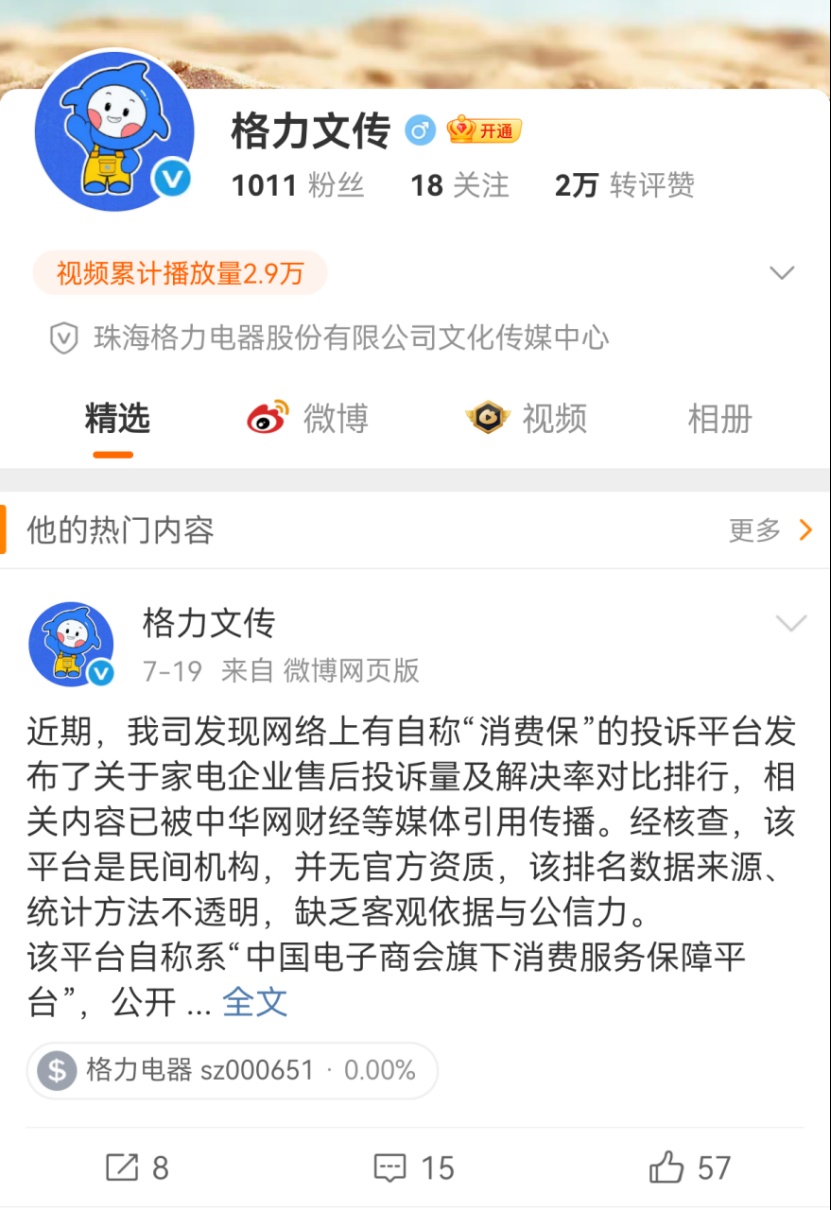 文章发布后,被多家媒体转载,7月19日,微博账号“格力文传”发布声明称,数据缺乏客观依据与公信力,且“消费保”平台运营主体已被吊销营业执照。