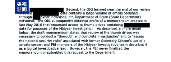美司法部21日解密的报告截图 根据司法部监察长办公室的说法,这些U盘包含高度敏感信息,有的来自国务院等美国政府机构,有的来自时任总统奥巴马的电子邮件,甚至也有可能包括国会信息。但这些U盘从未被作为希拉里“邮件门”事件的一部分被审查。