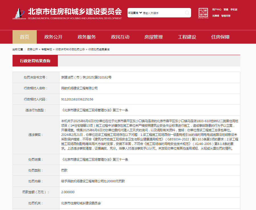齐鲁晚报·齐鲁壹点记者于北京市住房和城乡建设委员会(下称“北京住建委”)官网获悉,7月15日,民航机场建设工程有限公司(下称“民航建工”)因施工现场存在事故隐患收到罚单,行政处罚决定书文号为京建法罚(市)字[2025]第010162号。