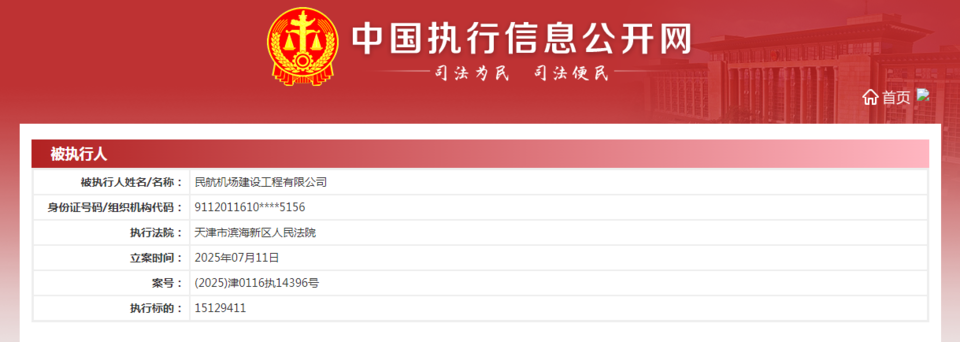 值得注意的是,齐鲁晚报·齐鲁壹点记者在中国执行信息公开网查询到,民航建工新增一条被执行信息,其于7月11日被天津市滨海新区人民法院执行标的15129411元,案号(2025)津0116执14396号。