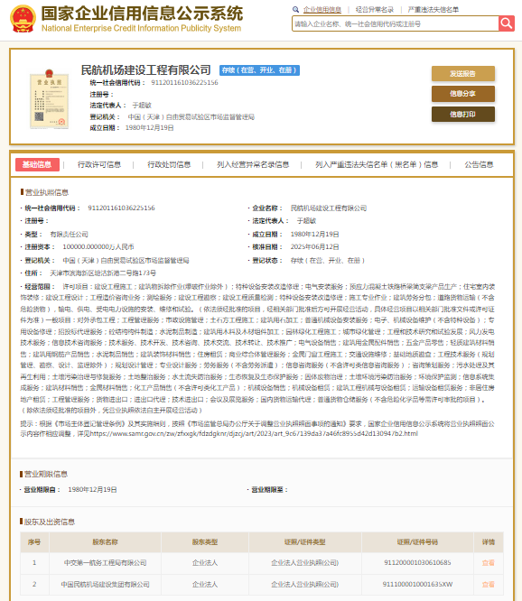 国家企业信用信息公示系统显示,民航机场建设工程有限公司成立于1980年,注册资本100000万元人民币,法定代表人为于超敏,两股东分别为中国民航机场建设集团有限公司、中交第一航务工程局有限公司。