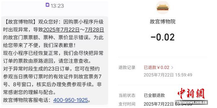 记者看到,这条以故宫博物馆名义发出的短信内容为:“观众您好:因购票小程序升级时出现异常,导致2025年7月22日至7月28日的故宫门票票额、票种、票价显示错误。为此给您带来了不便,我们深表歉意!现在小程序已经恢复正常,我们会尽快把异常订单的票款由原路退回,请您注意查收。由于故宫周一闭馆,您在异常时段生成的28日订单,可在7月27日或29日,携带订票时的有效证件到故宫票务7号、8号窗口,核实后办理免费参观手续。非常感谢您的理解与配合。故宫博物院客服电话:400-950-1925。”