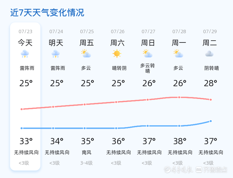 今天是7月23日,农历六月廿九,星期三。德州市今天以雷阵雨天气为主,气温在25℃至33℃之间。目前气温23.7℃,湿度98%,PM2.5指数23,空气质量良好。各区天气情况基本一致,均为雷阵雨天气,风力较小,南风1级。
