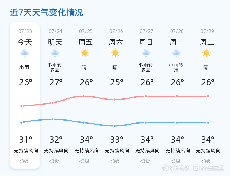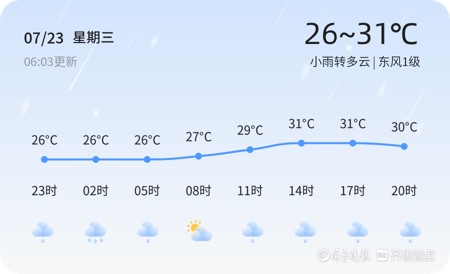 今日(7月23日,星期三,农历六月廿九)济宁市迎来小雨天气,气温在26℃至31℃之间,东风1级,空气湿度为83%,PM2.5指数为27,空气质量良好。全市各区天气情况基本一致,均为小雨转多云,市民出行需携带雨具,注意防雨防滑。