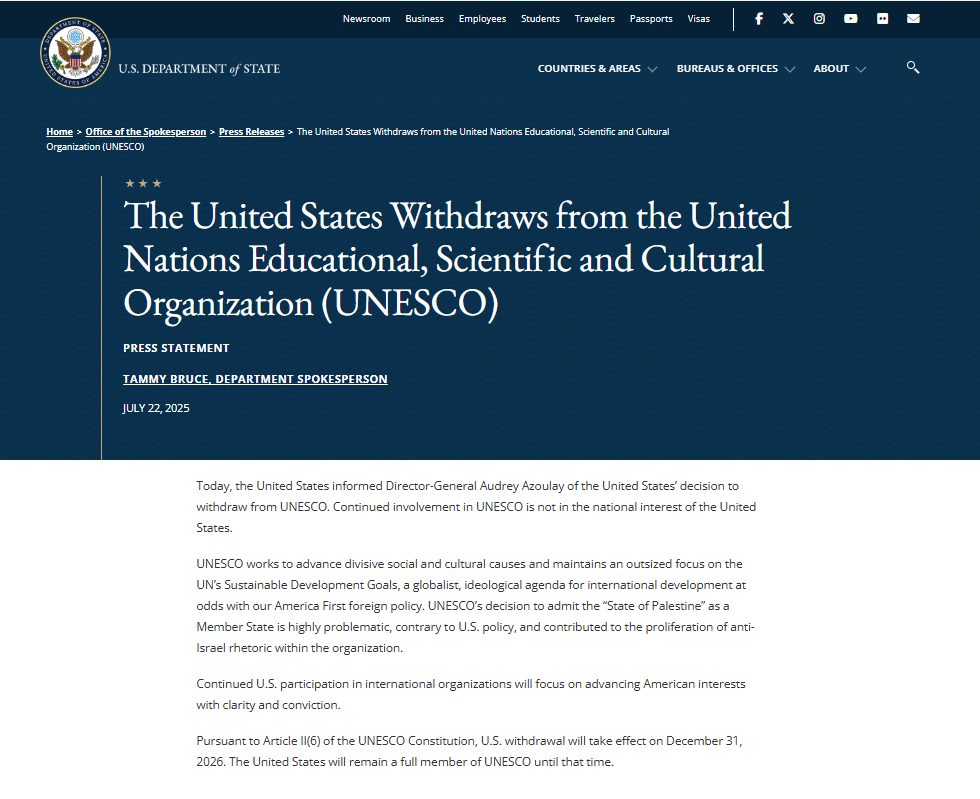 美国国务院发言人塔米·布鲁斯当地时间7月22日发表声明称,美国已向联合国教科文组织总干事阿祖莱通报了美国退出该组织的决定。根据相关程序,美国将于2026年12月31日正式退出联合国教科文组织。