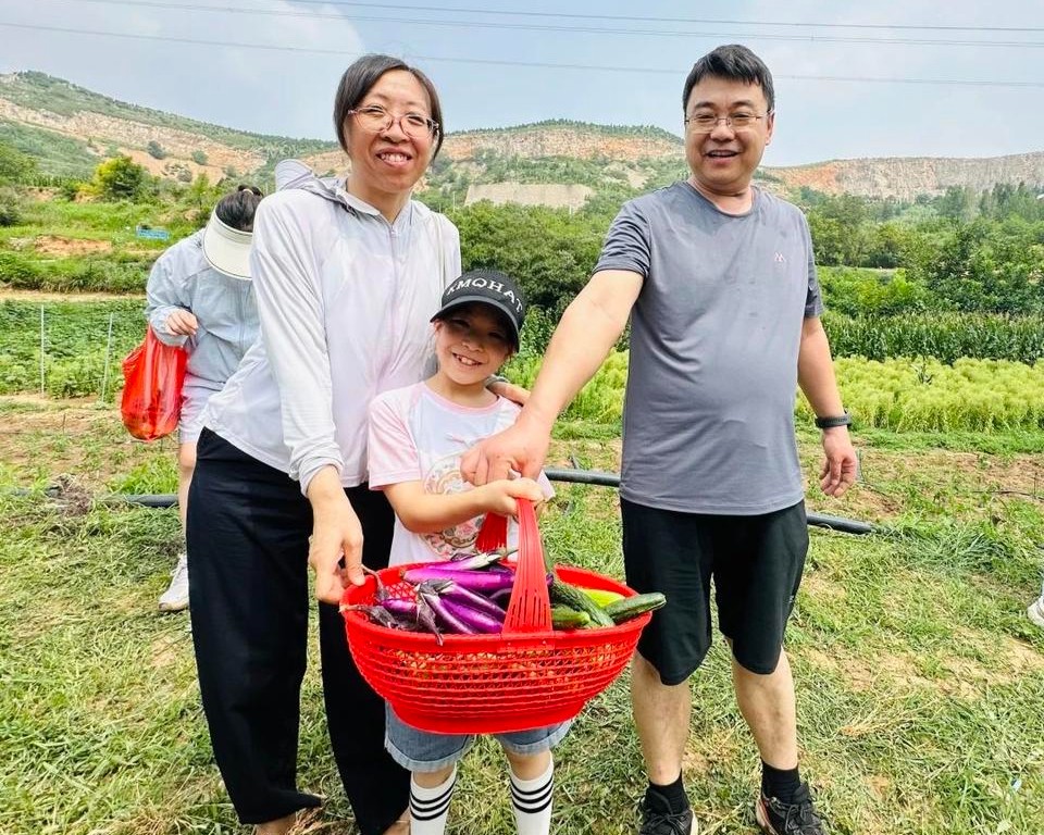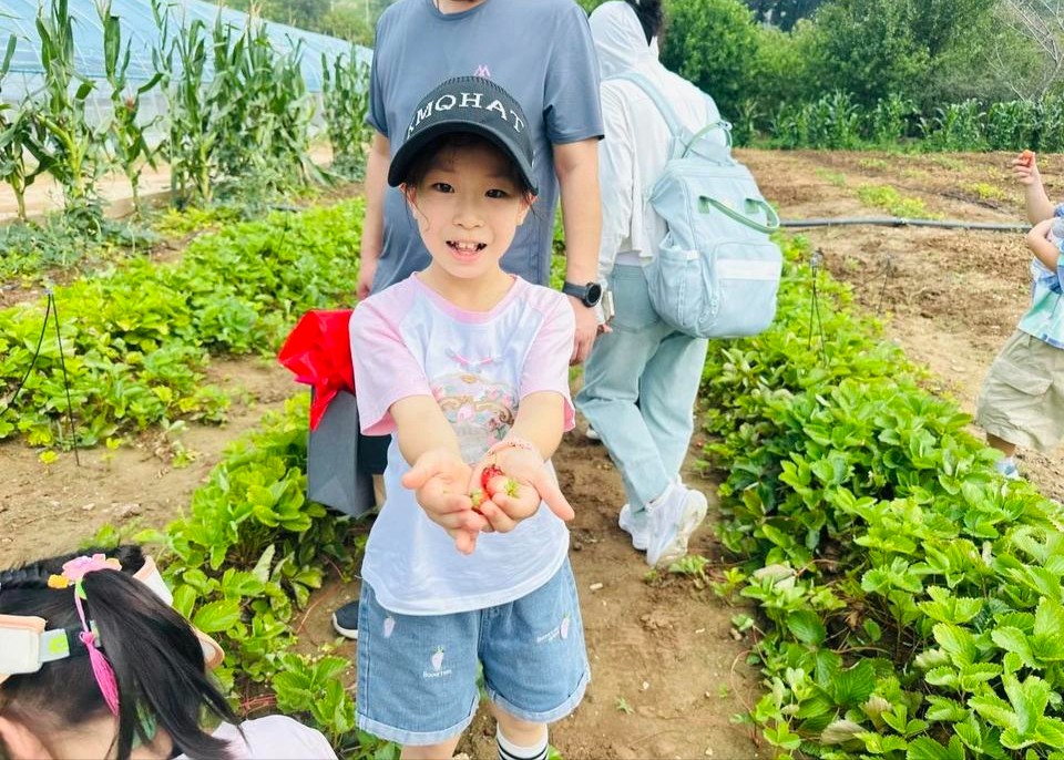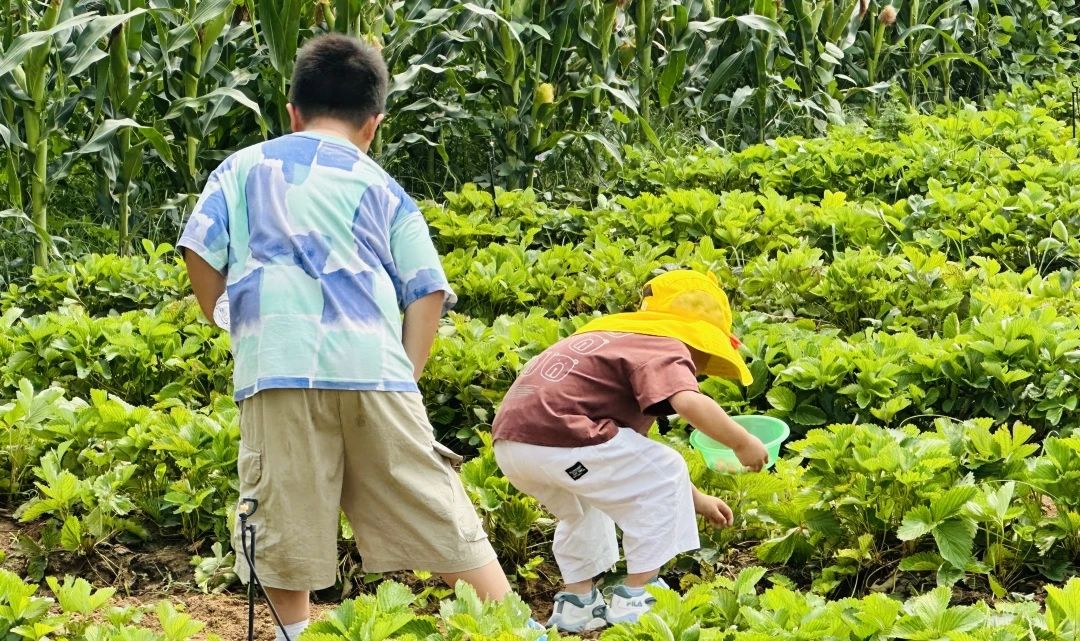 黄瓜架下,孩子们踮着脚寻找顶着小黄花的 “绿翡翠”,小手被毛刺扎得痒痒也乐此不疲;西红柿藤前,红彤彤的 “小灯笼” 被轻轻摘下,还带着太阳的余温;圆滚滚的紫甘蓝像个神秘星球,几个家庭合力才把它 “请” 出菜地;最激动的是发现藏在藤蔓下的条纹西瓜,“砰砰砰” 的敲击脆响引来了欢呼,爸爸们当起了 “大力士”,说道:“嚯!真沉!这一夏天的阳光雨露都在里面了!”