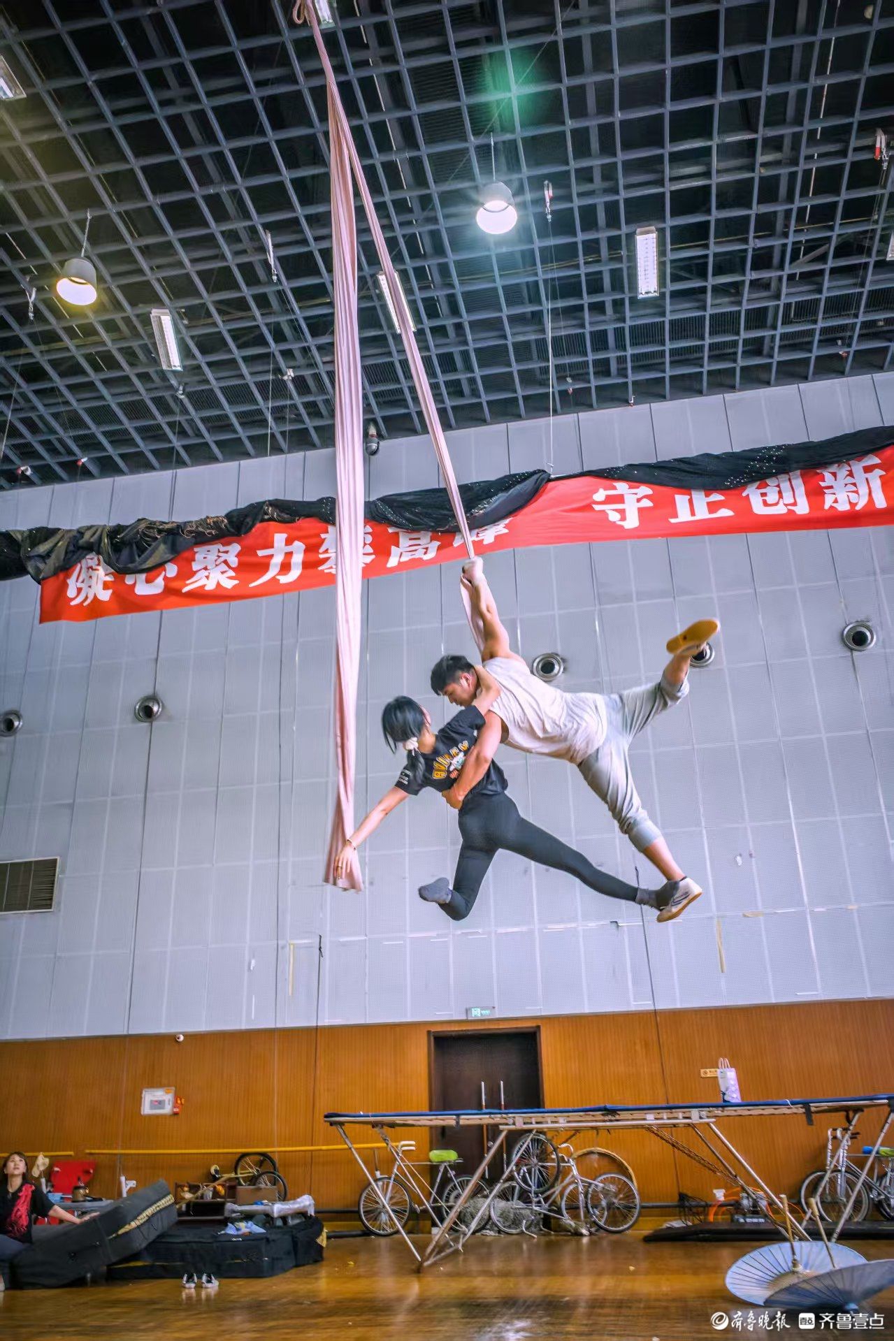 7月13日,在济南市槐荫区腊山河东路,济南市杂技团的演员们正在排练。
