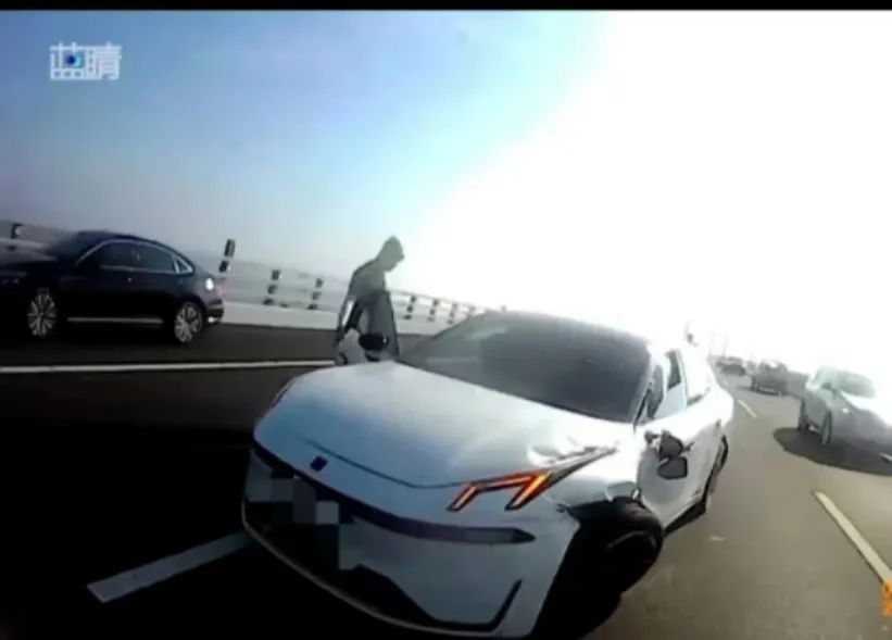 7月1日上午7点半左右,山东省公安厅交通管理局直属高速二支队胶州湾跨海大桥大队执勤民警驾驶警车巡逻至济南方向48公里处时,发现路面上发生一起交通事故。一辆白色新能源汽车停在中间行车道上,左侧车头受到严重撞击,车轮明显偏移出车身。民警立即下车处置,驾驶车辆的女子站在应急车道内。