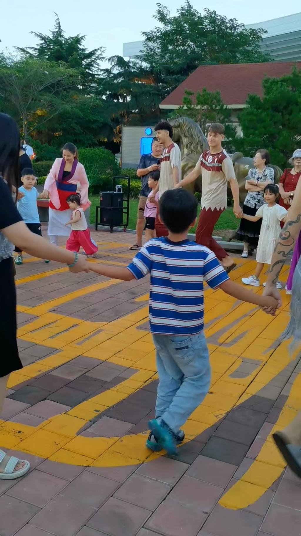 在啤酒城里,当夜幕开始降临,花式巡游的队伍就开始在啤酒城里出现。热情洋溢的中外年轻人们,载歌载舞,他们一边舞着,一边将围观的孩子们拉进来,围着圈儿跳舞。成为巡游队伍中的一员,孩子们特别高兴。