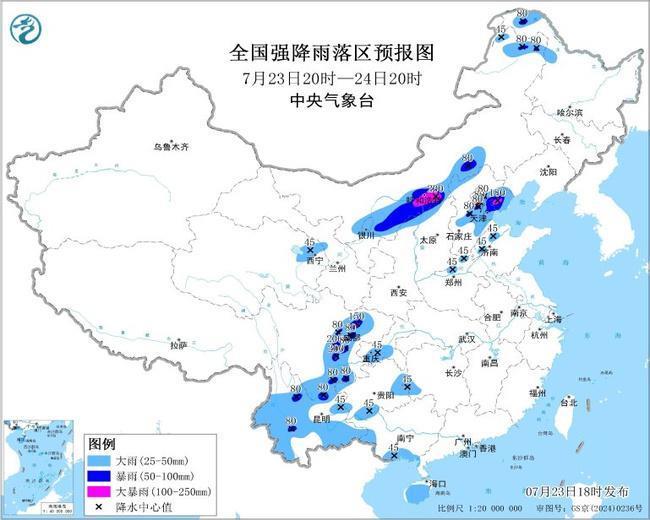 预计,7月23日20时至24日20时,内蒙古东北部和中西部偏南地区、宁夏北部、陕西北部、山西北部、河北中东部和西北部、天津、北京中东部、河南东北部、山东西北部、四川盆地西部、重庆南部、贵州东部和南部、云南中北部、广西西部和南部、海南岛以及青海东北部、黑龙江西北部等地部分地区有大到暴雨,其中,内蒙古中西部偏南地区、河北东北部、四川盆地西部等地局地有大暴雨(100~200毫米)。上述部分地区伴有短时强降水(最大小时降雨量20~50毫米,局地可超过70毫米),局地有雷暴大风等强对流天气。