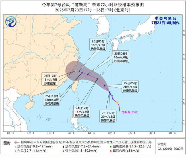 今年第7号台风“范斯高”(热带风暴级)的中心今天(23日)下午5点钟位于浙闽交界东偏南方大约1070公里的洋面上,就是北纬22.2度、东经129.5度,中心附近最大风力有8级(20米/秒),中心最低气压为995百帕,七级风圈半径为100~260公里。