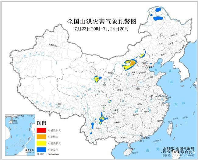 预计,7月23日20时至24日20时,山西北部、内蒙古中部、青海东部、四川中东部、云南北部、陕西北部等地部分地区发生山洪灾害可能性较大(黄色预警),其中,山西北部、内蒙古中部等地局地发生山洪灾害可能性大(橙色预警)。其他地区也可能因局地短历时强降水引发山洪灾害,请各地注意做好实时监测、防汛预警和转移避险等防范工作。