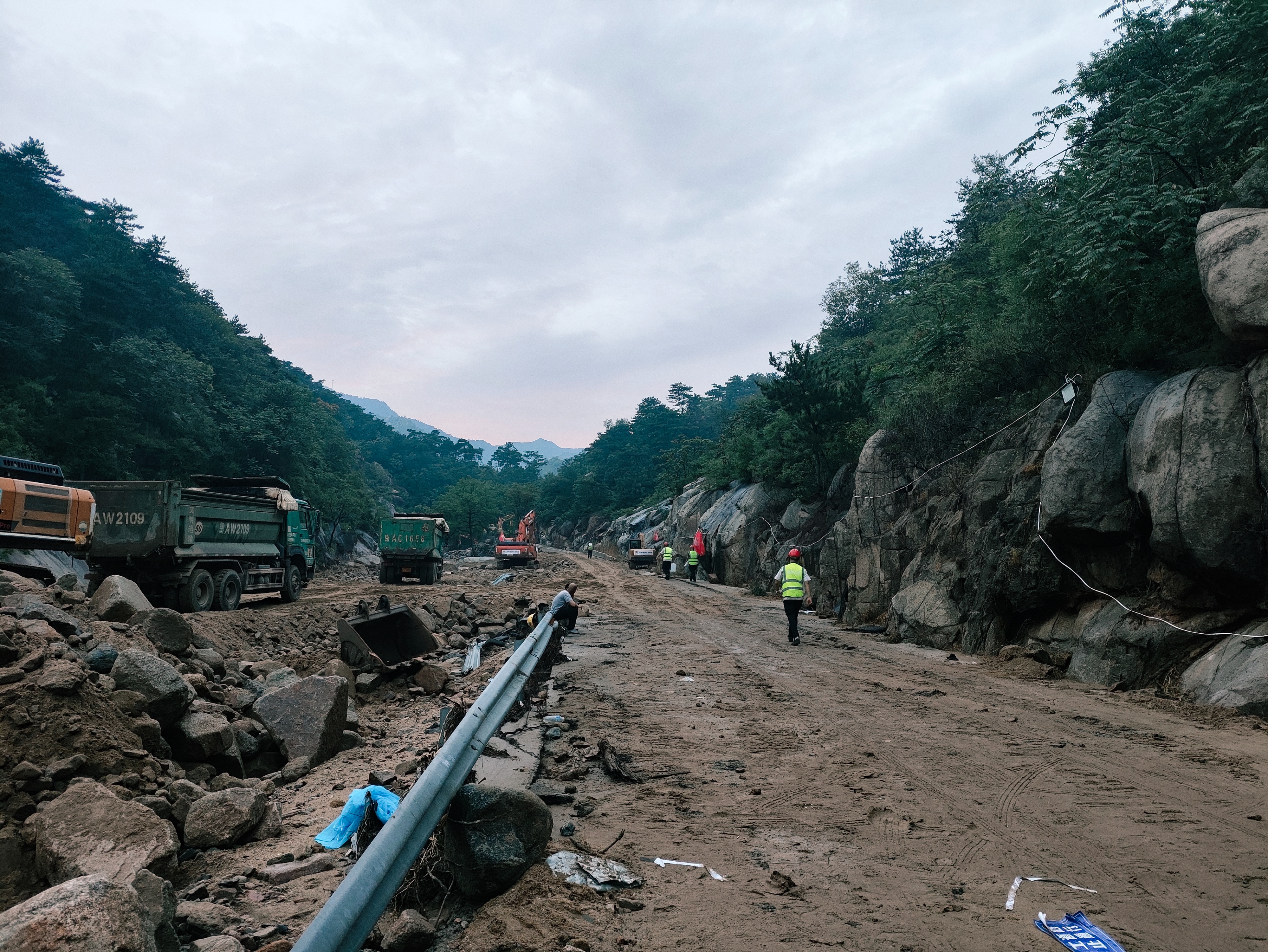现场的卡车拉了一斗又一斗石材来,要把路基重新填满。