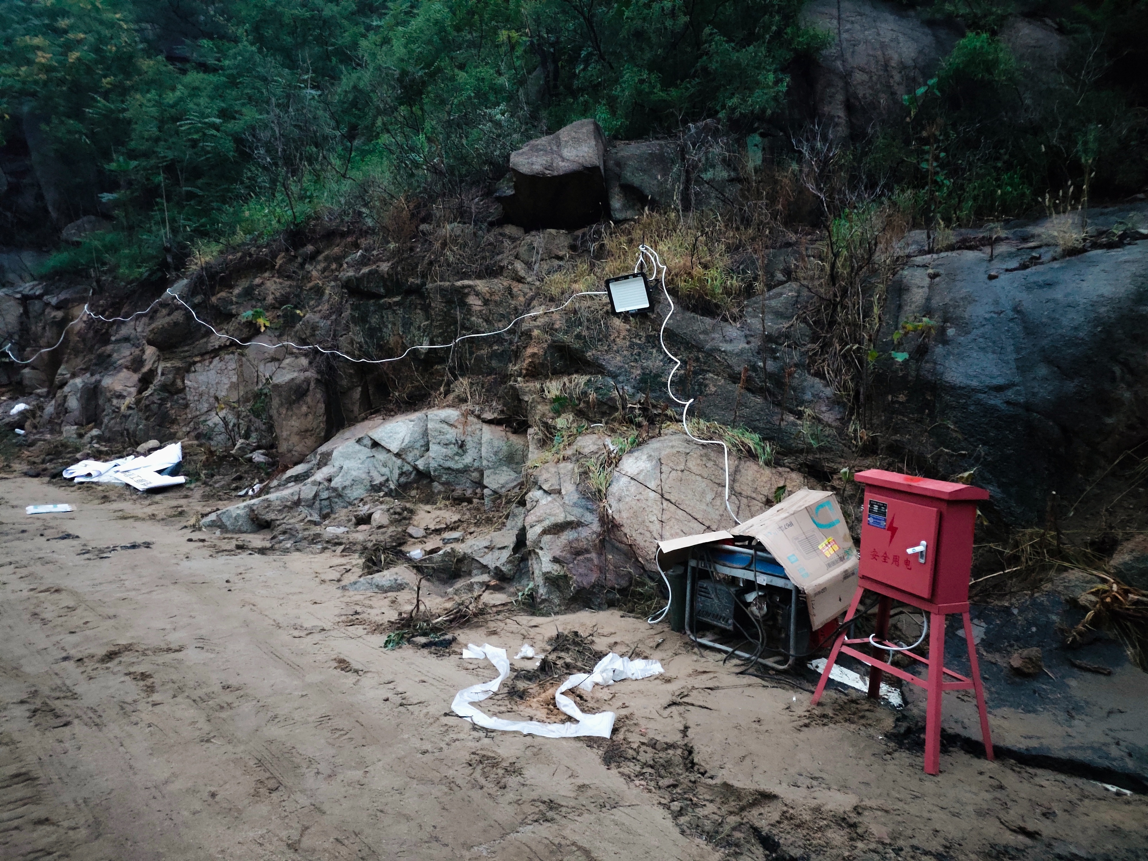 他们坐在大石块上歇一口气,从大王庄镇上采购晚饭的队友也将带回一顿热饭,餐后他们需要继续和雨水抢时间。“你看,架上了照明灯,今天晚上我们准备连夜赶工”。
