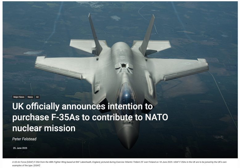 △《欧洲安全与防务》报道:英国正式宣布将采购F-35A隐形战斗机以为北约核任务做贡献。