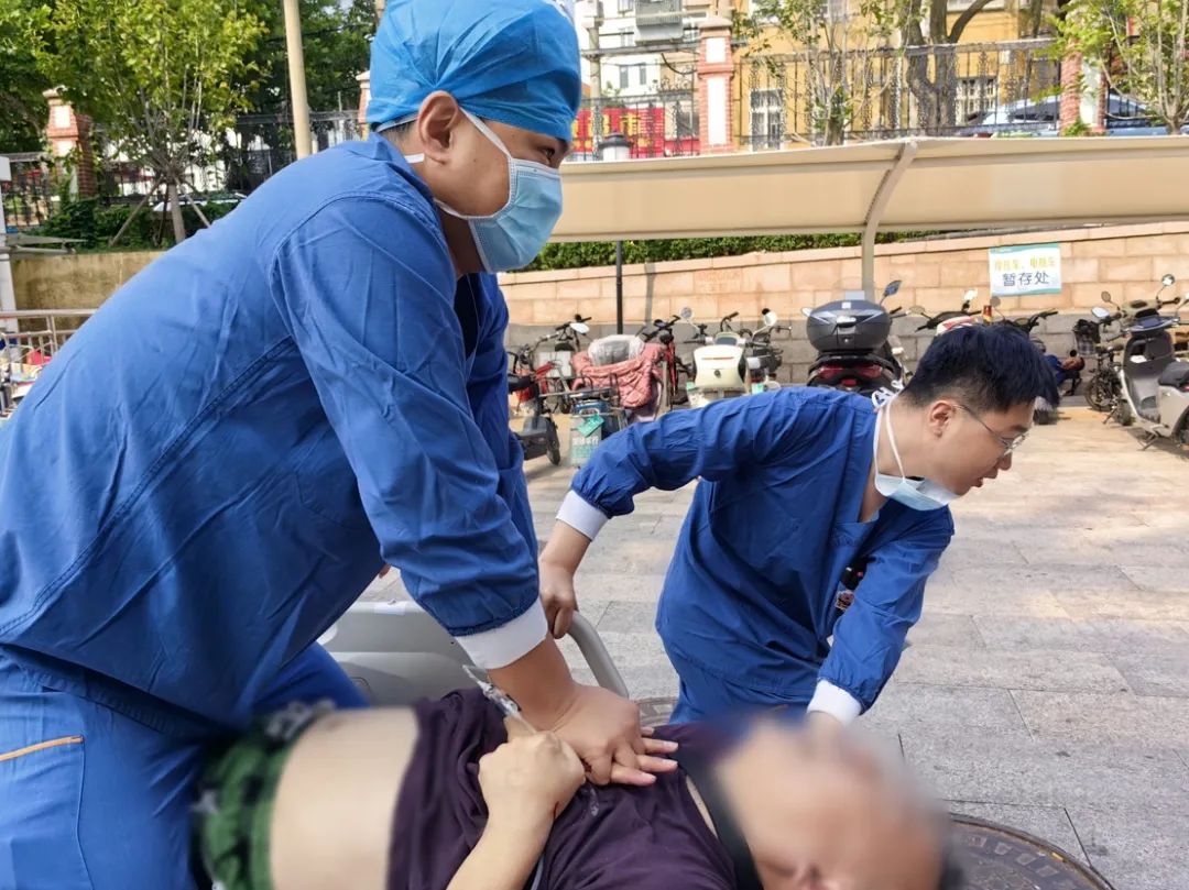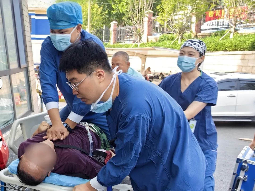 急诊分诊护士武君、潘智超闻讯立刻携带急救箱赶到医院南门外,由刘晓泉接替进行胸外按压,张永强、潘智超迅速为患者开放气道并使用呼吸囊辅助通气,武君则第一时间为患者建立了静脉通路。转运平车到达后,众人合力将患者抬至车上,张永强跳上平车继续进行按压,抢救团队以最快速度将患者推到急诊抢救室。