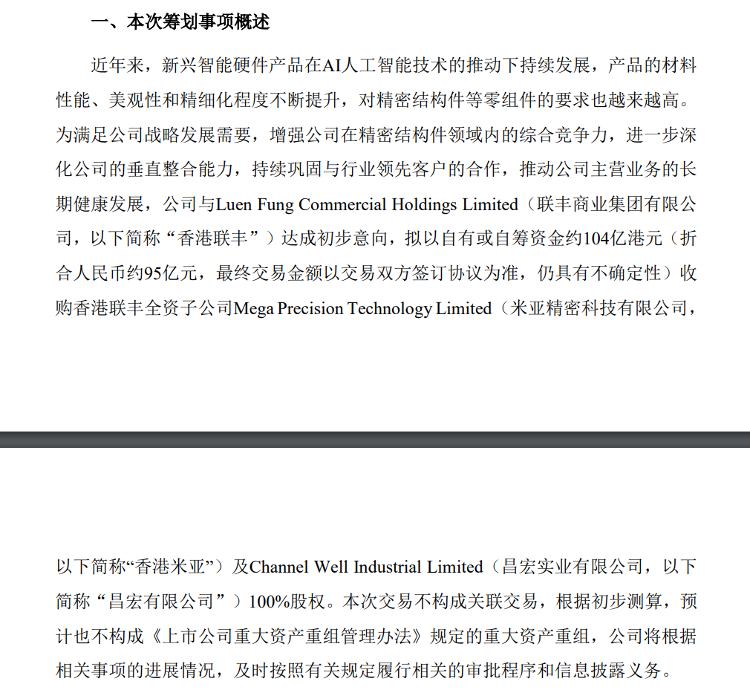 7月22日晚间,歌尔股份发布公告称,为满足公司战略发展需要,增强公司在精密结构件领域内的综合竞争力,公司与香港联丰达成初步意向,拟以自有或自筹资金约104亿港元(折合人民币约95亿元)收购香港联丰全资子公司Mega Precision Technology Limited(米亚精密科技有限公司)及Channel Well Industrial Limited(昌宏实业有限公司)100%股权。