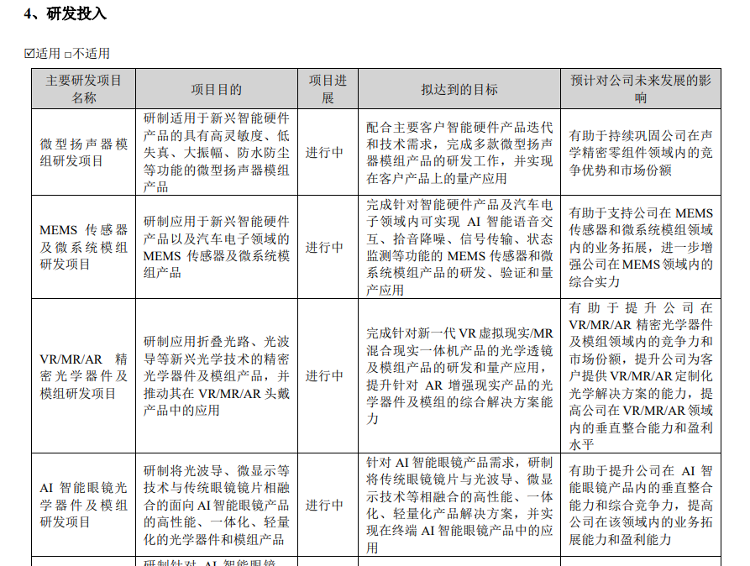 今年备受市场关注的AI只能眼镜产品,歌尔股份早有布局。2024年年报指出,公司目前在研发的智能眼镜相关项目包括AI智能眼镜光学器件及模组研发项目AR投影光学模组研发项目。