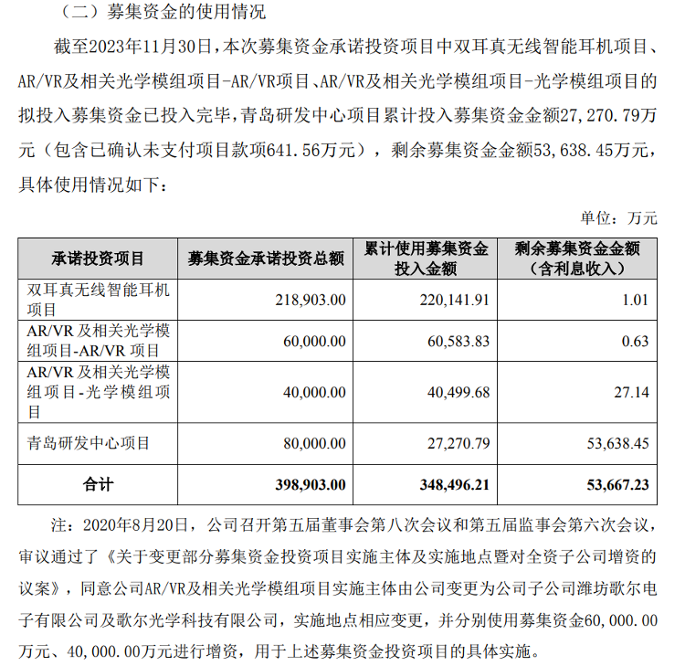 歌尔股份发布的关于变更部分募集资金用途并永久补充流动资金公告