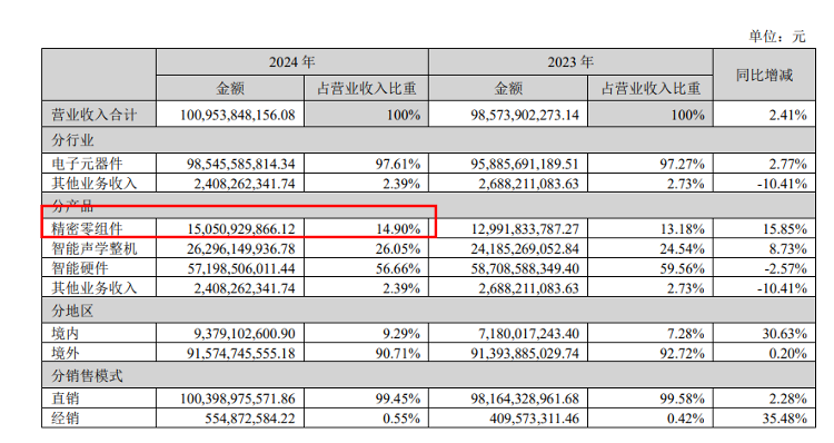 据悉,歌尔股份目前已有精密结构件业务,公告显示,2024年,精密结构件业务所属板块“精密零组件”在公司的营收占比超过14%。