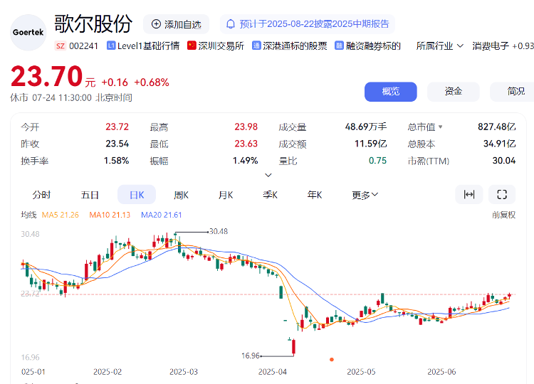 提到歌尔股份的“行业领先客户”这一关键词,投资者难免会想到:苹果。不过,此前受苹果订单因素的影响,歌尔股份的股价也从最高56元跌至16元附近。但截止7月24日开盘,歌尔股份的股价报23.72元/股。今年以来,其股价虽有波动,但目前已呈上扬态势。