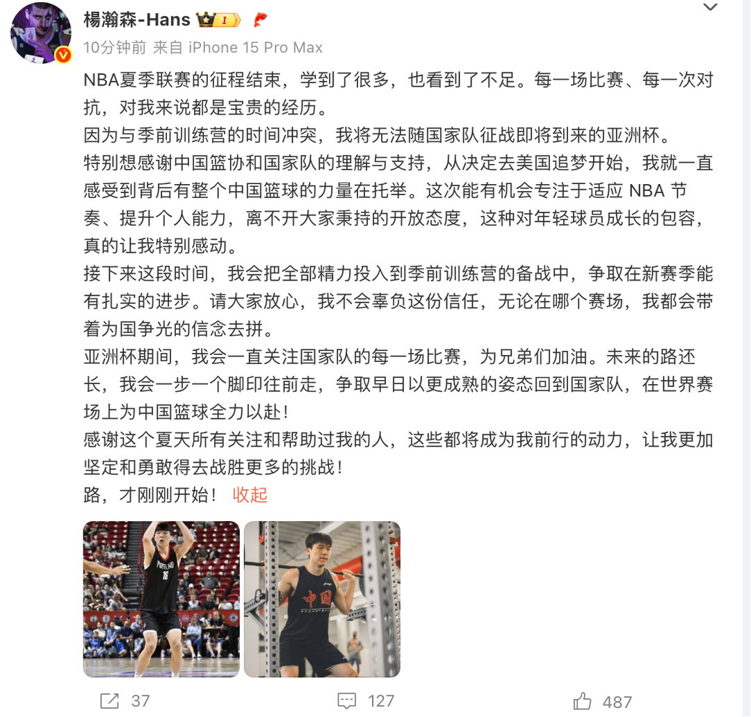 由于杨瀚森参加的开拓者短训营和8月5日至17日的国际篮联男子亚洲杯日程重叠,经综合评估,并从运动员本人和中国篮球长远发展考虑,中国篮球协会同意杨瀚森不参加2025年男篮亚洲杯的国家队集训与比赛,全力以赴备战新赛季。目前杨瀚森已于今日回到国内办理签证等个人事务。