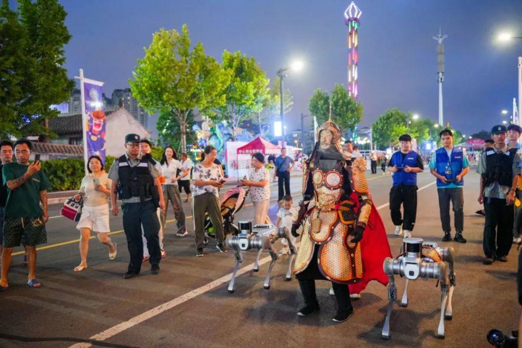 在城内,记者还看到了一台身披铠甲的人形机器人领队,两台活泼可爱的机器狗相伴,它们带着满满的科技感,从啤酒文化博览区出发,沿着啤酒大道一路行至东啤酒文化广场附近,展现出古风与科技相融的独特魅力。