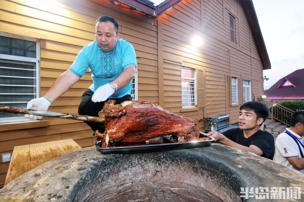 晚上7时许,和田夜市木屋外,厨师吾布力卡斯穆从比人还高的窑中拎出一只烤全羊。“这只烤全羊有10公斤,10-12个人吃没问题。一只烤全羊从腌制到出炉要经过6个小时,前期需要经过2个小时的腌制,后期需要经过4个小时的烤制,每天能出炉2到3只。”