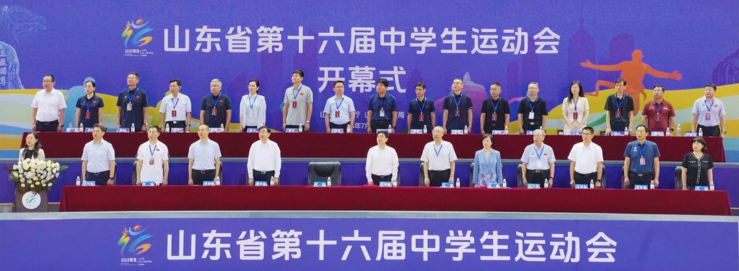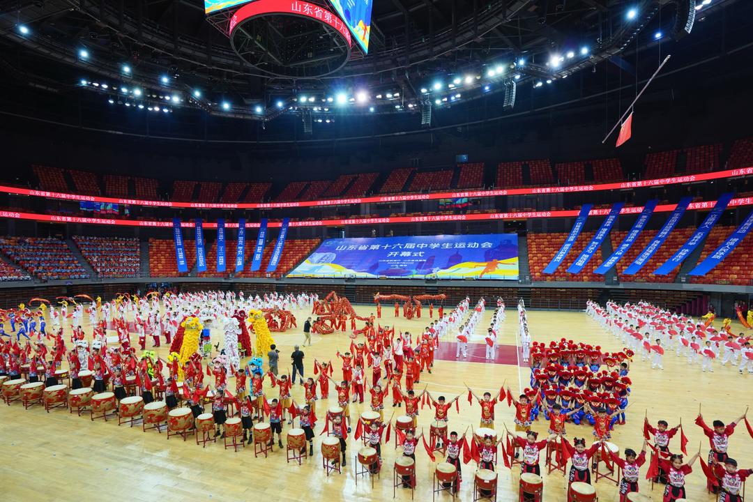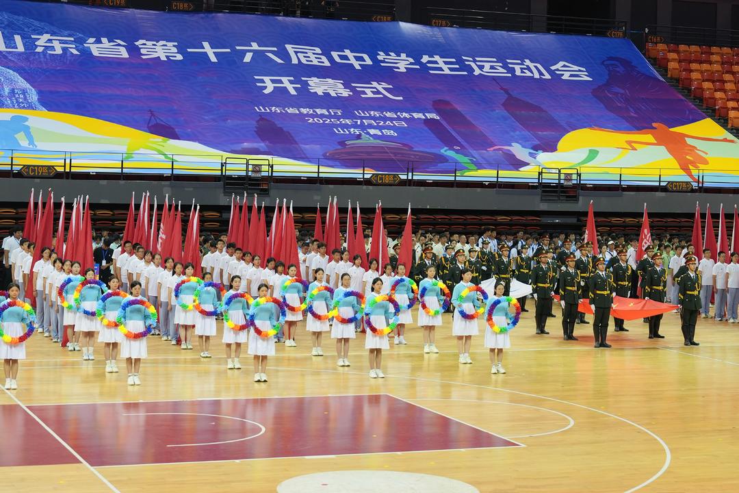 7月24日上午,山东省第十六届中学生运动会开幕式在青岛市民健身中心体育馆举行。