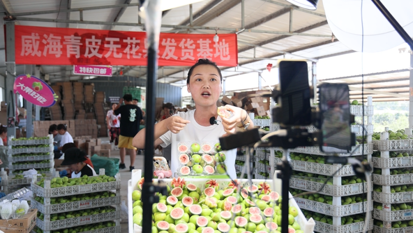 “家人们看过来,这刚摘的无花果,新鲜多汁!”7月21日,在靠山村分拣园区的临时直播间里,鲁东大学学生孙宇航正熟练地推荐着乳山无花果。直播吸引超万人次观看,单日助销无花果1200斤。