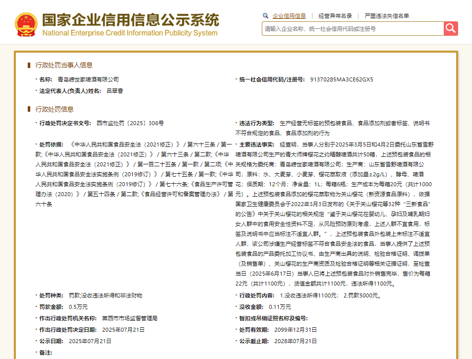 经监管部门查明,该公司于2025年3月及4月委托山东省雪野啤酒有限公司生产了共计50箱“青大师牌樱花之约精酿啤酒”。该产品中添加了关山樱花萃取液。依据国家卫生健康委2022年发布的《关于关山樱花等32种“三新食品”的公告》,鉴于关山樱花在婴幼儿、孕妇及哺乳期妇女人群中的食用安全性资料不足,相关食品标签必须明确标注“不适宜人群”警示信息。然而,青岛崂世家啤酒有限公司销售的这批啤酒外包装上并未按要求进行标注,存在食品安全风险隐患。