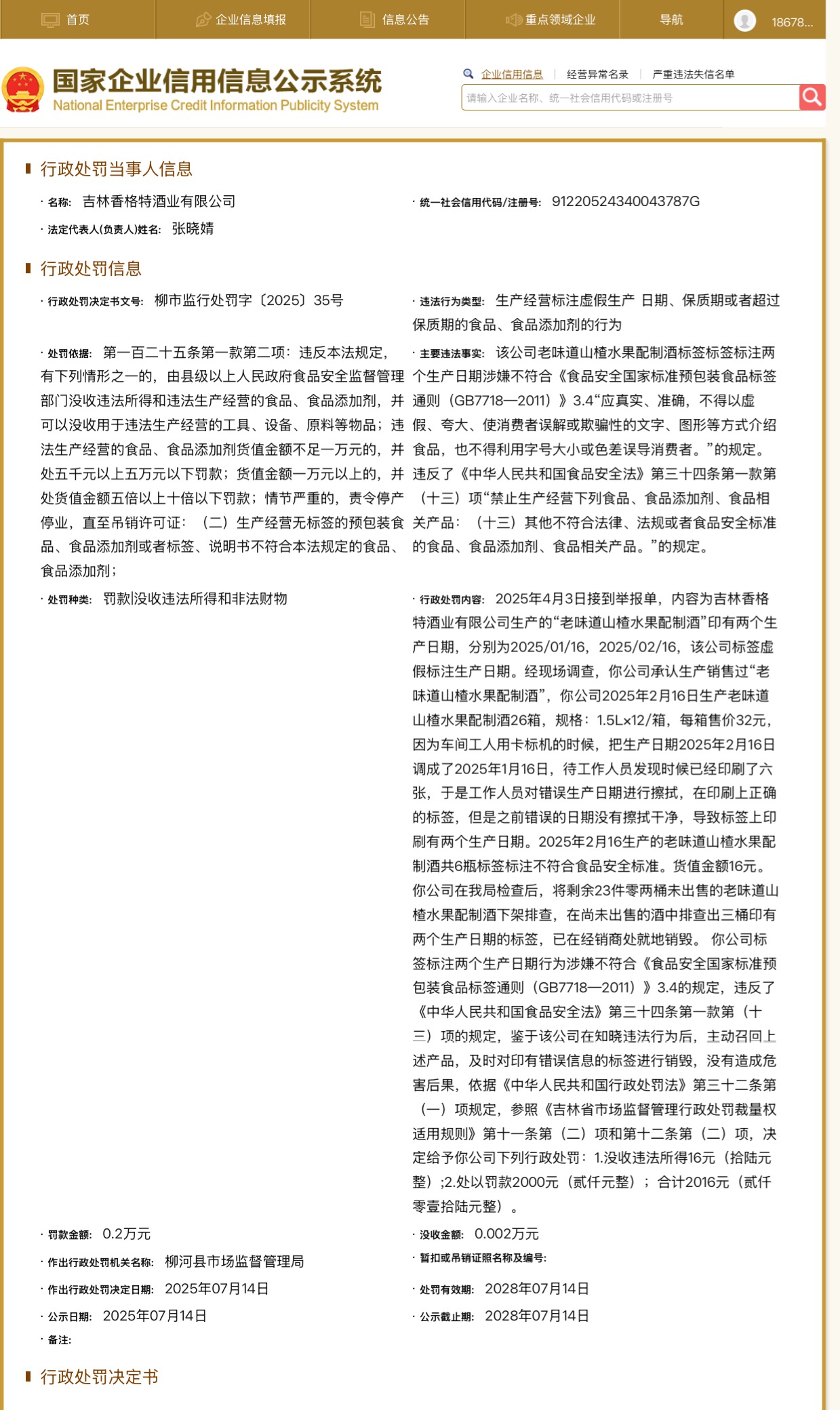 近日,柳河县市场监督管理局公布行政处罚决定(柳市监行处罚字〔2025〕35号),吉林香格特酒业有限公司因生产的“老味道山楂水果配制酒”标签上同时标注两个不同生产日期,被处以罚款2000元、没收违法所得16元的行政处罚。