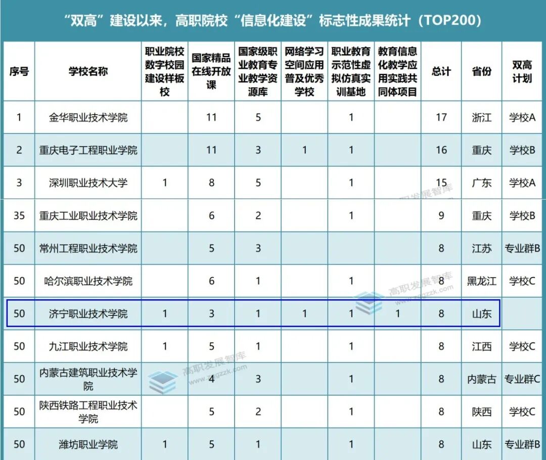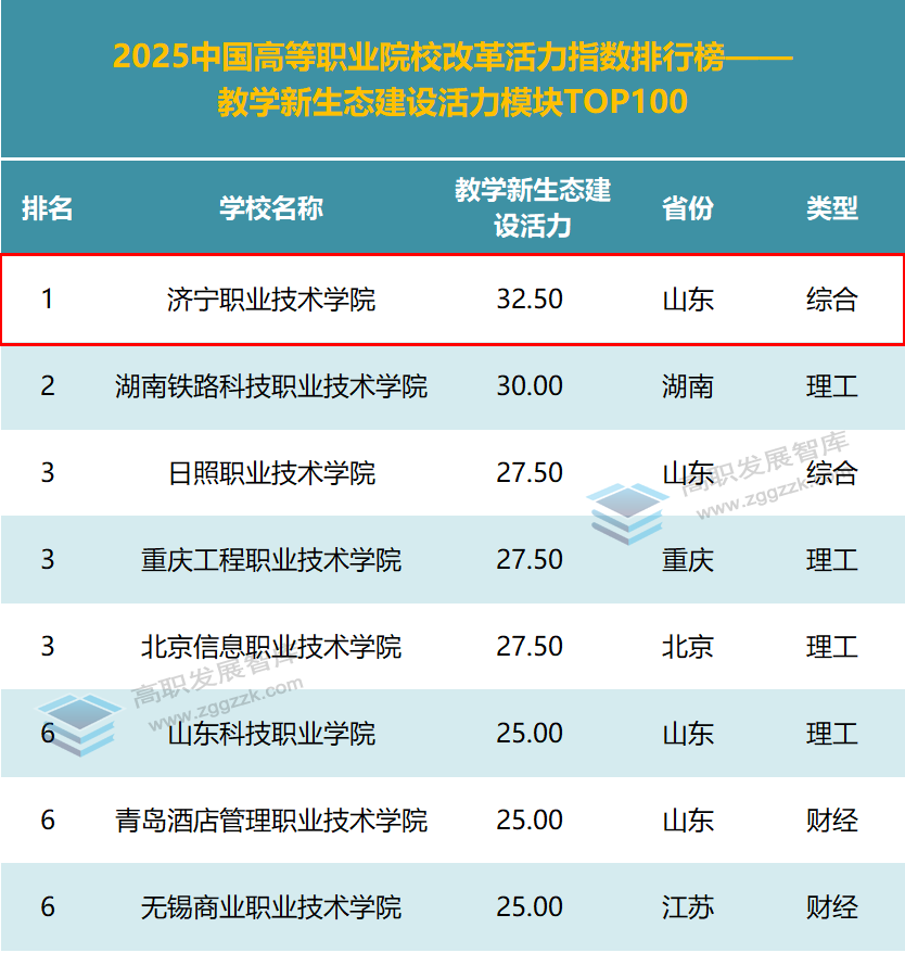 近日,高职发展智库发布2025中国高等职业院校改革活力指数排行榜——教学新生态建设活力百强榜,济宁职业技术学院位居第一名。