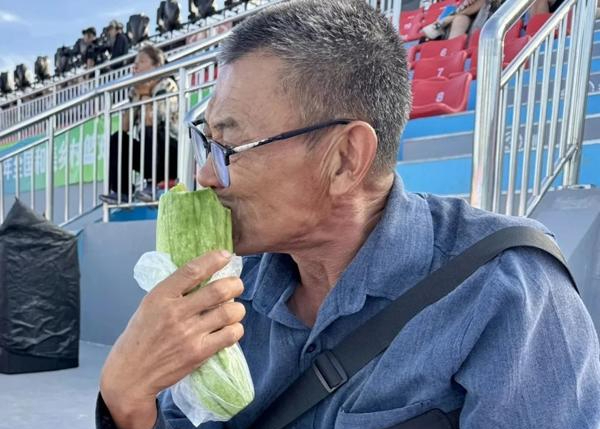 村民一边啃着大甜瓜,一边看球,乐在其中