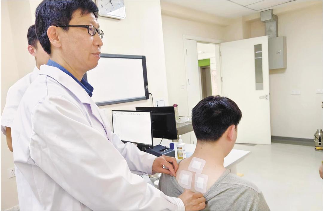 图|山东省中医院外治中心主任杨继国在为患者贴敷三伏贴。